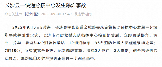 “长沙消防”微信公众号消息,9月6日5时许,长沙县榔梨街道金成路壹米滴答长沙分拨中心发生一起爆炸事故并引发火灾,长沙市消防救援支队指挥中心接到报警后,立即调派榔梨、黄兴、龙华、泉塘共4个消防救援站、12辆消防车、95名消防救援人员赶赴现场处置;7时15分,火灾被完全扑灭。此次爆炸事故,造成2人死亡、2人重伤,伤者已经送医院救治,爆炸原因及财产损失正在进一步调查当中。