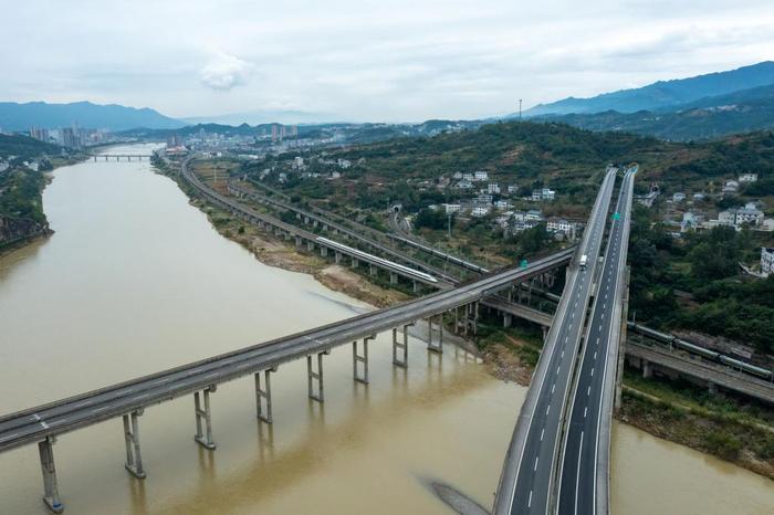 这是在四川省广元市拍摄的嘉陵江“交通博物馆”——老川陕路、京昆高速、宝成铁路、西成高铁、嘉陵江航道在这里交织“奔腾”(无人机照片)。 新华社记者 沈伯韩 摄