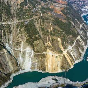 这是坐落于雅砻江畔悬崖绝壁上的四川省凉山彝族自治州冕宁县里庄镇全阁村的通村路(无人机照片)。 新华社记者 沈伯韩 摄