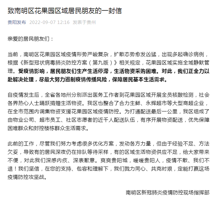 当日,贵阳市南明区新冠肺炎疫情防控现场指挥部发布《致南明区花果园区域居民朋友的一封信》,就居民生活物资供应不足问题公开致歉。