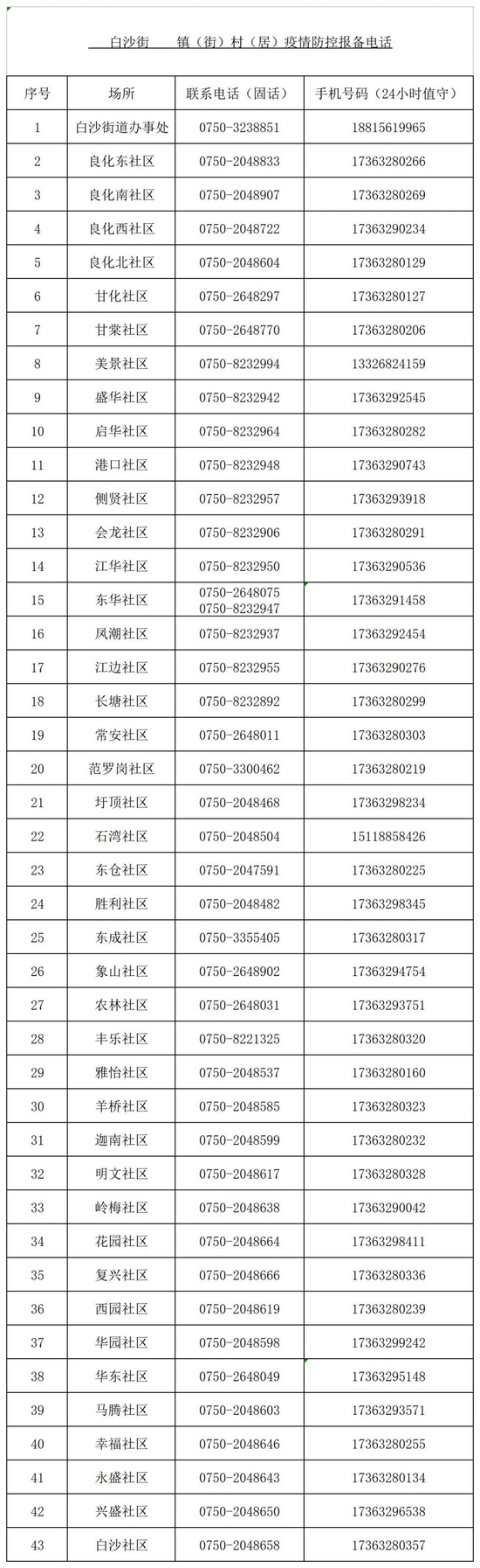 白沙街道办事处、社区疫情防控报备电话