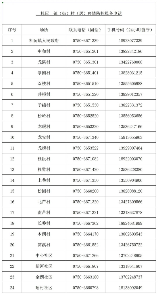 杜阮镇、村疫情防控报备电话