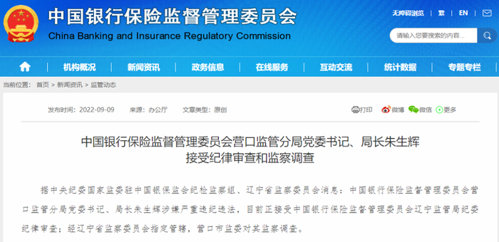 9月9日,据中央纪委国家监委驻中国银保监会纪检监察组、辽宁省监察委员会消息:中国银行保险监督管理委员会营口监管分局党委书记、局长朱生辉涉嫌严重违纪违法,目前正接受中国银行保险监督管理委员会辽宁监管局纪委纪律审查;经辽宁省监察委员会指定管辖,营口市监委对其监察调查。