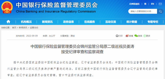 同日,据中央纪委国家监委驻中国银保监会纪检监察组、辽宁省监察委员会消息:中国银行保险监督管理委员会锦州监管分局原二级巡视员姜涛涉嫌严重违纪违法,目前正接受中国银行保险监督管理委员会辽宁监管局纪委纪律审查;经辽宁省监察委员会指定管辖,营口市监委对其监察调查。