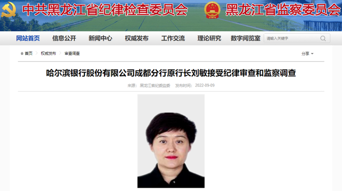 同日,据黑龙江省纪委监委网站发布消息,哈尔滨银行股份有限公司成都分行原行长刘敏涉嫌严重违纪违法,目前正接受纪律审查和监察调查。