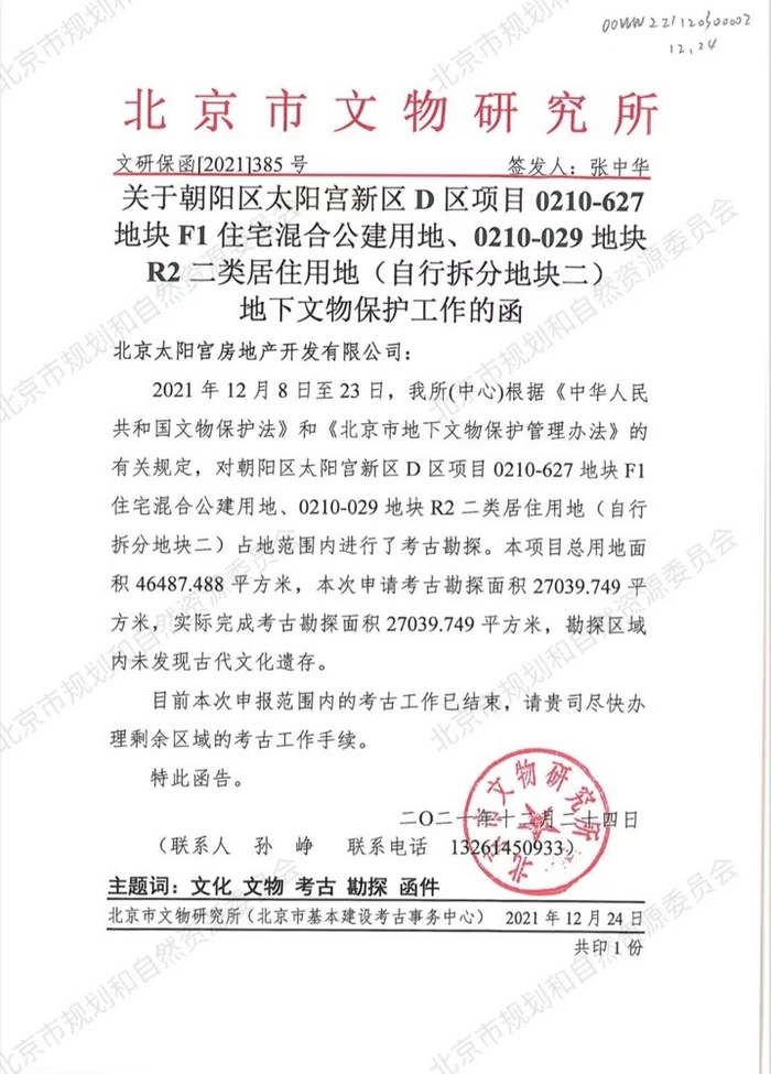 从0210-029地块的交易文件看,北京市文物研究所此前对相邻的0210-627和0210-029地块进行了考古探勘,对46487.488平方米地块中的27039.749平方米完成了勘探,并没有发现古代文化遗存。