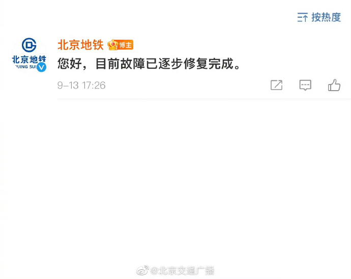 北京地铁:目前故障已逐步修复完成。