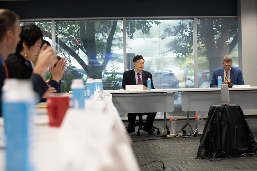 秦大使在致辞中表示,很高兴再次来到美国中西部,与大家共话中美气候智慧型农业合作。今年春天,我第一次走进美国腹地,结识了许多热情友善的美国农民和真诚推动中美农业合作的各界朋友,见证了中美农业合作的种子已经深深扎根于这片广袤的土地。我有幸当了一天农夫,深入美国农民的家,亲身体验农业劳作的苦与乐。当时,我向腹地州的朋友们承诺:“丰收季再见”。今天我回来了。