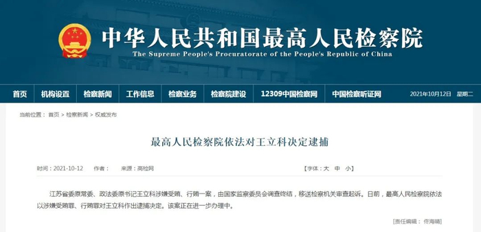 据最高检官网2021年10月12日消息,江苏省委原常委、政法委原书记王立科涉嫌受贿、行贿一案,由国家监察委员会调查终结,移送检察机关审查起诉。