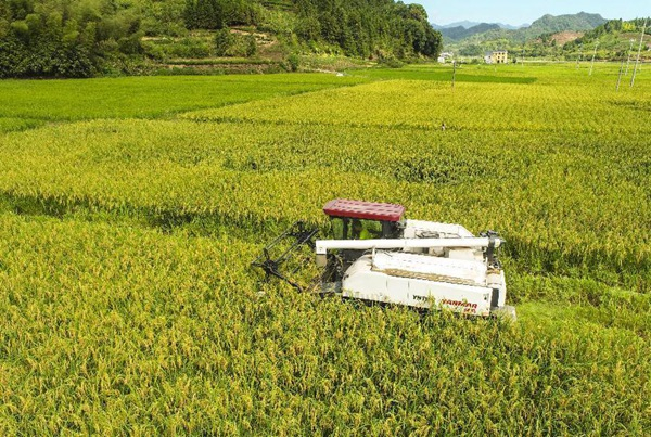 ▲2022年9月5日,杭州淳安县汾口镇千岛湖谷香园农业有限公司“巨型稻”基地内,一台崭新的收割机来回穿梭,正在收割“巨型稻” (图片提供/视觉中国)
