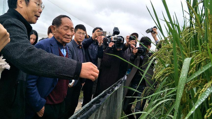 ▲“2017年10月16日,中国科学家成功育选最高2.25米的“巨型稻”。图为已故“杂交水稻之父”袁隆平观察“巨型稻”生长情况 (图片提供/视觉中国)