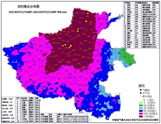 河南“7·20”极端暴雨过程持续时间长、累积雨量大、强降雨范围广,河南中北部大部地区过程累计降雨量超500毫米,其中郑州和新乡连续2天出现特大暴雨。(图片来源:河南省气象台)