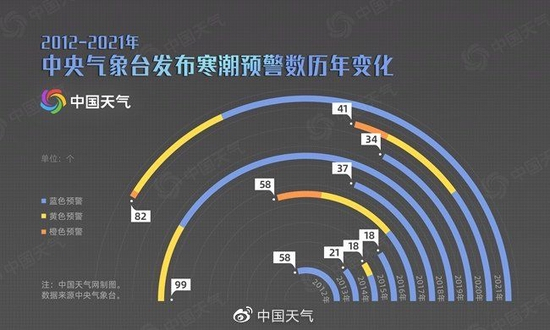 值得注意的是,极端暖频发的同时,极端冷事件依然存在,统计来看,中央气象台近10年间平均每年发布的寒潮预警30至60个,寒潮、强冷空气强度也并未减弱。