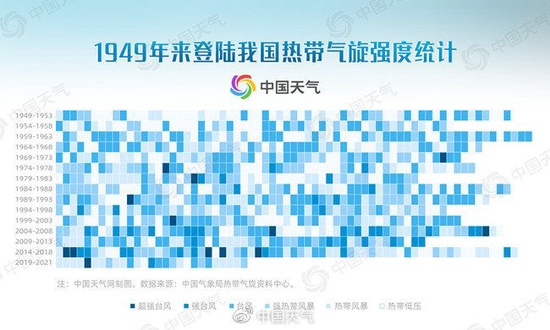 值得注意的是,以5年为代际统计发现,近年来登陆我国的台风中,台风及以上强度的台风变多了,尤其2004年以来的强台风及以上强度共39个,占总数的近七成(68%),其中2014至2018年有5个超强台风登陆我国。
