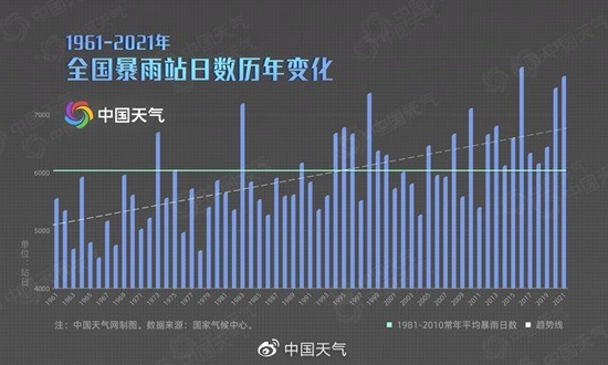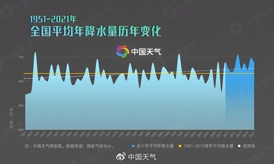 数据统计显示,1951年以来,我国平均降水量呈增加趋势,尤其2012至2021年是近70年来历史上最湿的十年。