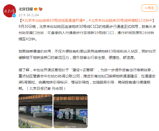 北京丰台站换乘10号线地面通道开通 丰台站换乘10号线将缩短12分钟