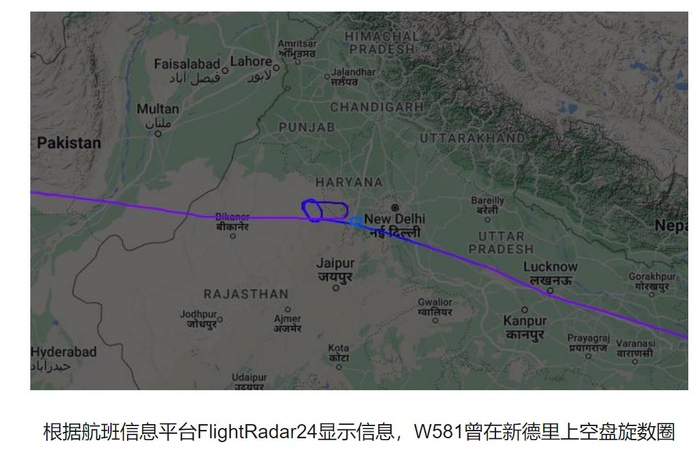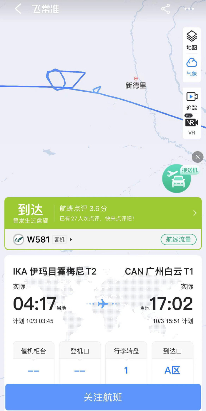 航班信息APP飞常准的数据显示,W581航班为一架空客A340客机,于当地时间3日4时17分从德黑兰出发,已于北京时间3日17时02分抵达广州。飞常准提供的航班飞行轨迹图显示,W581曾在新德里上空盘旋数圈。
