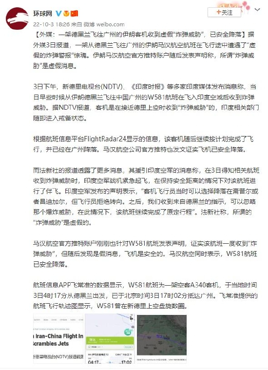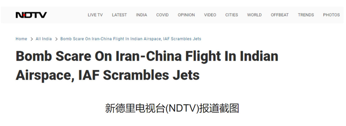 3日下午,新德里电视台(NDTV)、《印度时报》等多家印度媒体发布消息称,当日早些时候从伊朗德黑兰飞往中国广州的W581航班在飞入印度空域后收到炸弹威胁。据NDTV报道,客机是在接近德里上空时收到“炸弹威胁”的,印度相关部门随即进入戒备状态。