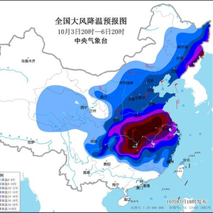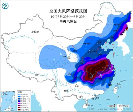 中央气象台预计,今天20时至10月6日20时,中东部大部地区气温普遍下降8~12℃,东北地区东部、黄淮大部、江淮、江汉、江南中北部及四川盆地东部等地部分地区降温12~16℃,其中,吉林东北部、河南南部、湖北大部、安徽中北部、江苏西部、湖南北部等地部分地区降温幅度可达18℃以上。