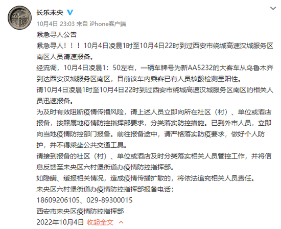 请10月4日凌晨1时至10月4日22时到过西安市绕城高速汉城服务区南区的相关人员迅速报备。