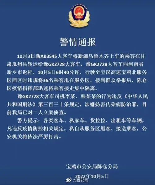 10月5日,陕西宝鸡市公安局陈仓分局发布通报,10月3日新AB3545大客车将新疆乌鲁木齐上车的乘客在甘肃瓜州县转运给豫GK2728大客车,豫 GK2728大客车向河南省新乡市返程,10月5日6时40分许,行驶至宝汉高速宝鸡北服务区西区时违规将 36 名乘客甩在服务区,接到群众举报后,陈仓区疫情指挥部迅速将乘客接走集中隔离。