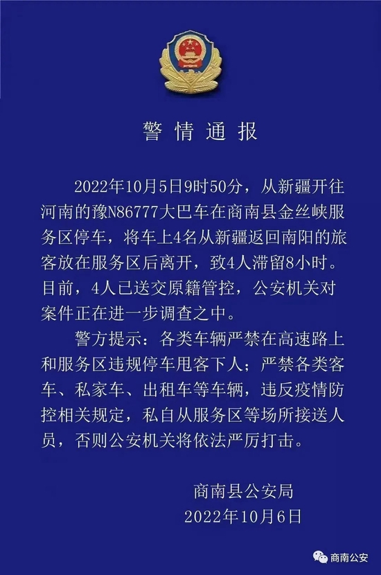 2022年10月5日9时50分,从新疆开往河南的豫N86777大巴车在商南县金丝峡服务区停车,将车上4名从新疆返回南阳的旅客放在服务区后离开,致4人滞留8小时。目前,4人已送交原籍管控,公安机关对案件正在进一步调查之中。
