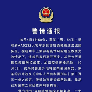 10月5日,西安市公安局未央分局通报:10月4日1时50分,蒙某(男,54岁)驾驶新AA5232大客车到达西安绕城高速汉城服务区,在明知车上乘客有疫情风险地区旅居史的情况下,违规甩客后离开西安。其行为严重违反疫情防控规定,加剧疫情传播风险。
