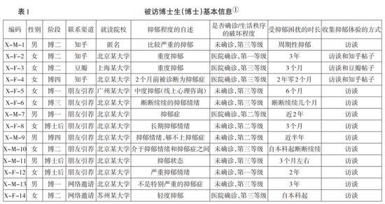 深度访谈可以随时调整问题,帮助研究者“解释性地理解被访者的意义世界”。通过网络邀请、私人关系等方式,我们对11位正在攻读博士学位的博士生和3位读博期间有过抑郁经历的博士后进行了深度访谈3。在14位访谈对象中,有5位经过医院确诊为抑郁症或抑郁状态,9位自陈正在或曾受抑郁困扰。(见表1)