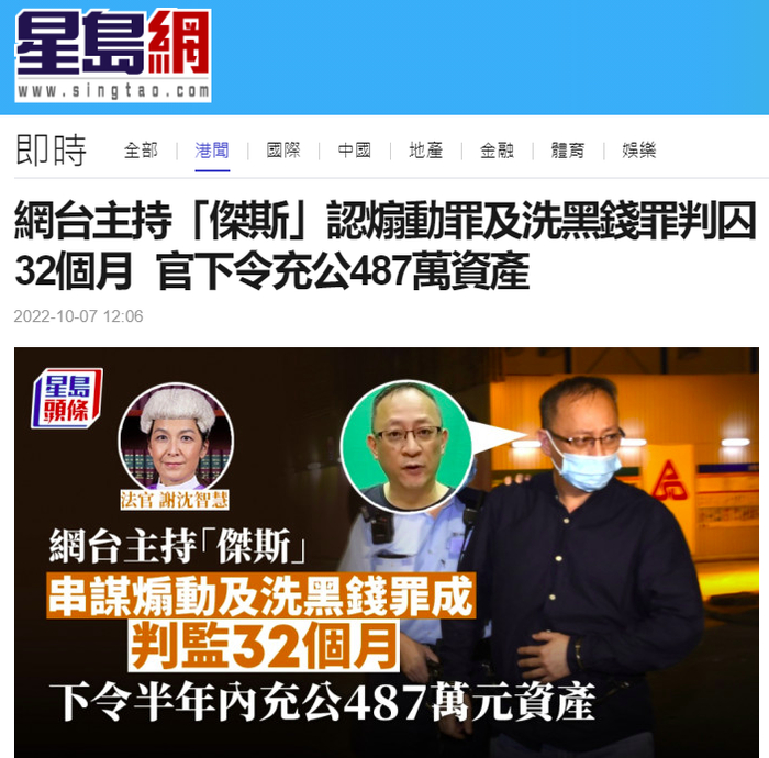 港媒:香港网台主持人杰斯承认煽动及洗黑钱罪,被判监禁32个月