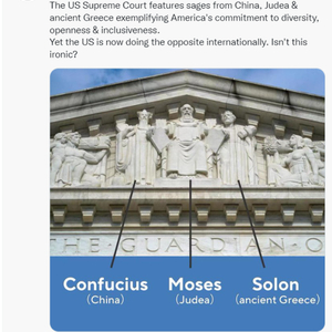 推文配图为美国最高法院大楼建筑的三角形门楣,其从左至右刻着代表孔子、摩西和梭伦的人物雕像。