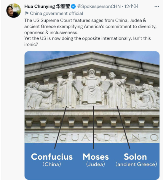华春莹发推称,“美国最高法院(门楣)雕刻了来自中国、犹地亚(以色列古地名)和古希腊的先贤形象,以彰显美国多元、开放、包容的精神。然而,美国现在在国际上却在做相反的事情。这不讽刺吗?”