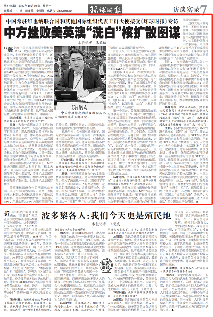 王群大使接受《环球时报》专访:中方挫败美英澳“洗白”核扩散图谋