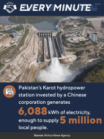 3。 每一分钟:中国企业投资援建的巴基斯坦卡洛特水电站发电量为6088千瓦时,足以满足当地500万人的用电需求