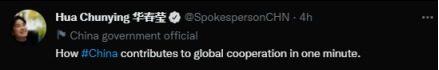 大约一小时后,华春莹又连续发布了另外10张图片,均是关于中国在中外合作交流上取得的辉煌成就,有中企项目为当地发展贡献巨大力量、有经贸合作为全球造福。她在该组图片中的第一张上方配文写道:“中国如何在一分钟内为全球合作做出贡献?”↓