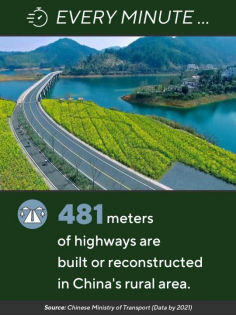 10。 每一分钟:中国农村地区新建或改建481米长的高速公路和道路