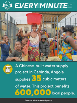 5。 每一分钟:中国企业在安哥拉卡宾达省建设的供水项目提供35立方米的水。该项目使60万当地民众受益