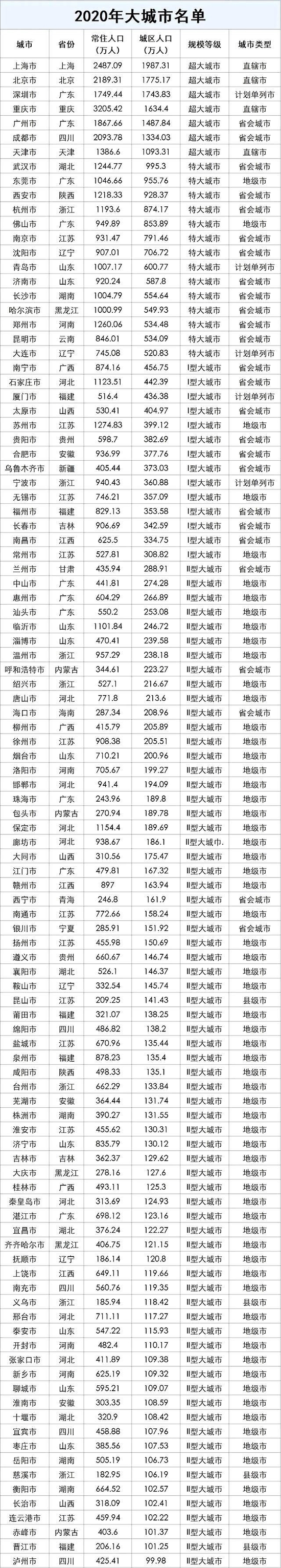 近日,国务院第七次全国人口普查领导小组办公室编制的《2020中国人口普查分县资料》显示,目前我国共有105个大城市,包括7个超大城市、14个特大城市、14个Ⅰ型大城市以及70个Ⅱ型大城市。