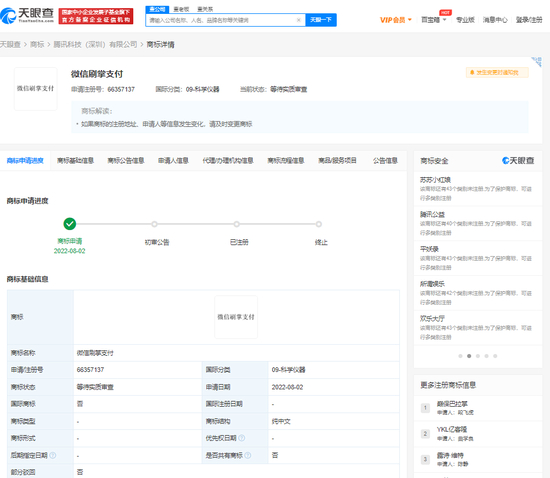 到今年8月初,腾讯公司申请了“微信刷掌支付”“微信刷掌”“wepalm”的相关商标,涉及社会服务、通讯服务、餐饮住宿、广告销售、建筑修理等多个国际类别。当前商标状态均为等待实质审查。