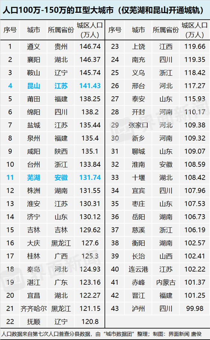 城区人口低于150万的大城市有43个,只有芜湖和昆山两个城市已开通城轨。昆山地铁是上海地铁的延伸线,只有6公里。芜湖开通了2条单轨,总里程为46.2公里。