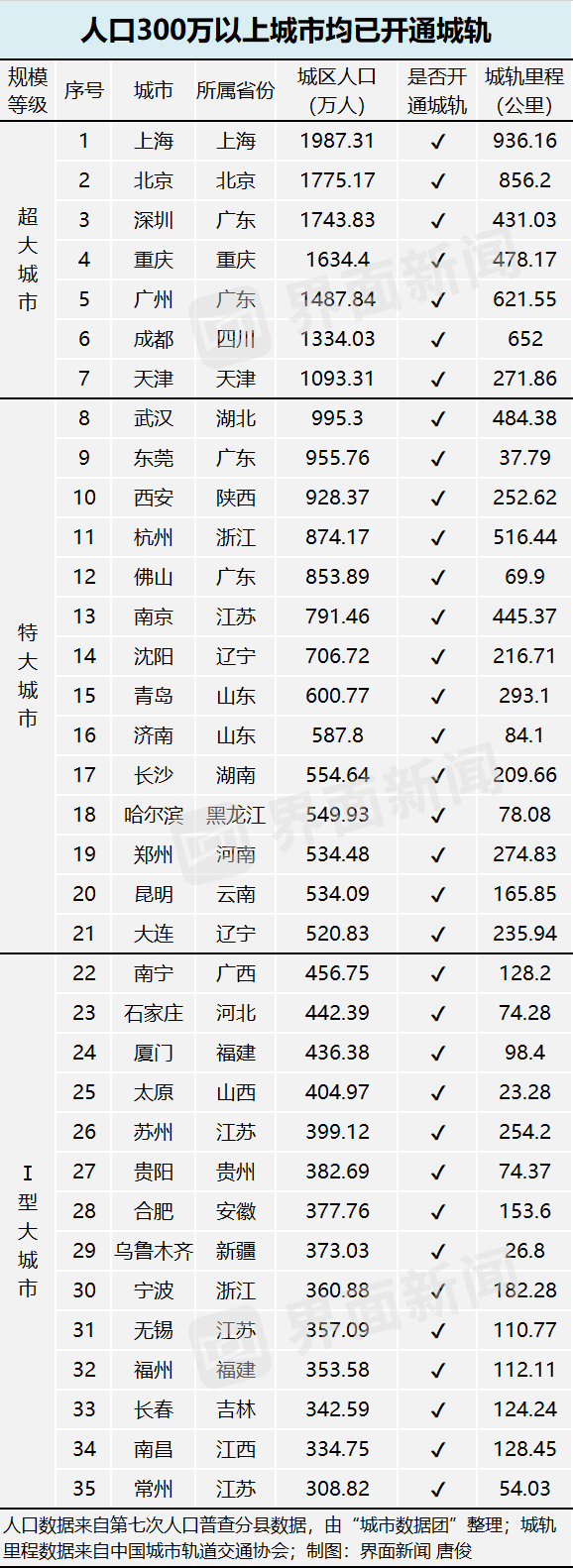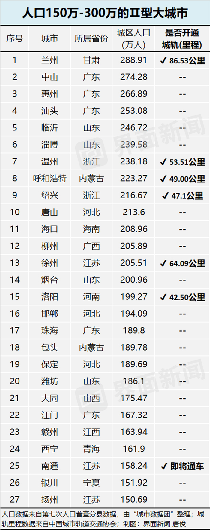 最新城市人口规模公布,这些大城市短期内与地铁无缘