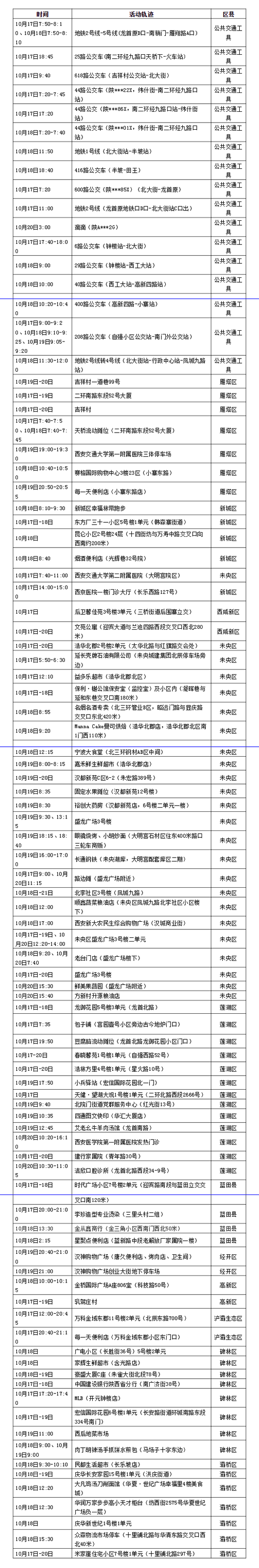 10月21日0-24时,西安市新增28例感染者(2例确诊病例,26例无症状感染者),其中,19例在集中隔离中发现,1例在外省输入落地检中发现,4例在中风险区筛查中发现,4例在社区筛查中发现。经初步流调,病例在隔离管控前涉及的活动轨迹为:
