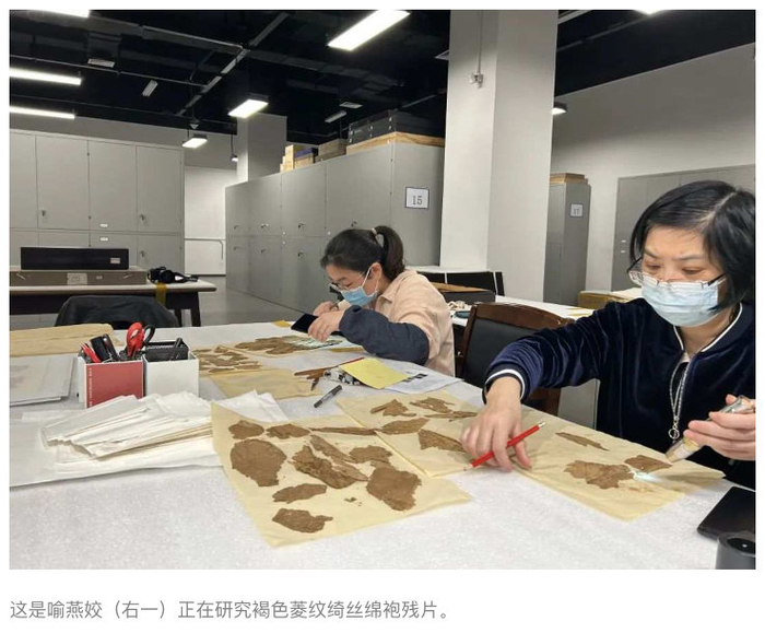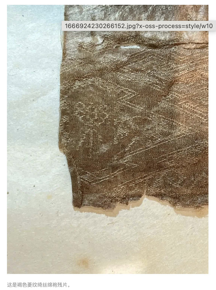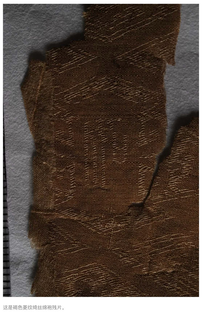据介绍,马王堆三号墓主人是“辛追夫人”儿子利豨的墓葬,由于密封不严、渗水严重,发掘时不少文物保存得并不完好。其中,褐色菱纹绮丝绵袍是被折叠放在标注有“裞衣两笥”的竹箱子中,出土时已破碎成块,并和箱子中的其他纺织品粘连成堆。