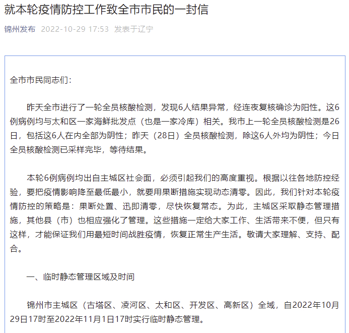 锦州市主城区(古塔区、凌河区、太和区、开发区、高新区)全域,自2022年10月29日17时至2022年11月1日17时实行临时静态管理。