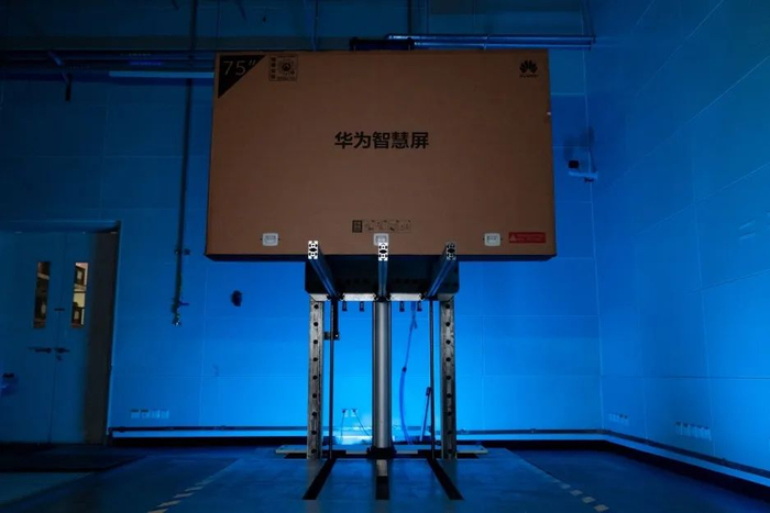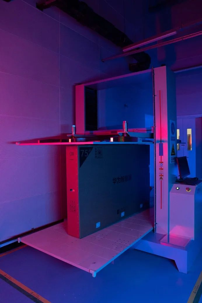 据实验室负责人介绍,这里就是华为智慧屏实验室必不可少的可靠性实验区,而这样“摔打”智慧屏的行为,每天都会进行上百次。因为智慧屏从工厂到用户家中,必然经过仓储、运输、搬运、安装等一系列过程。智慧屏在库房多层堆栈、长途物流运输过程中的颠簸、磕碰,以及在周转搬运过程中不可避免的跌落等都对包装一种挑战。