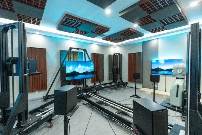 华为智慧屏实验室的音频实验室,由大型尖劈型全消声室和混响实验室组成,前者能够支撑智慧屏电声器件单体及整机声学测试,用于喇叭、麦克风、整机等声学基础性能;后者则支撑智慧屏整机智能语音唤醒率、误唤醒率客观测试的设备。通过业界顶级声学院校教授开展技术合作,华为确定沉浸度相关主客观评价指标,将产线测试结果与消声室结果进行对标,保证智慧屏产品声场沉浸度体验。
