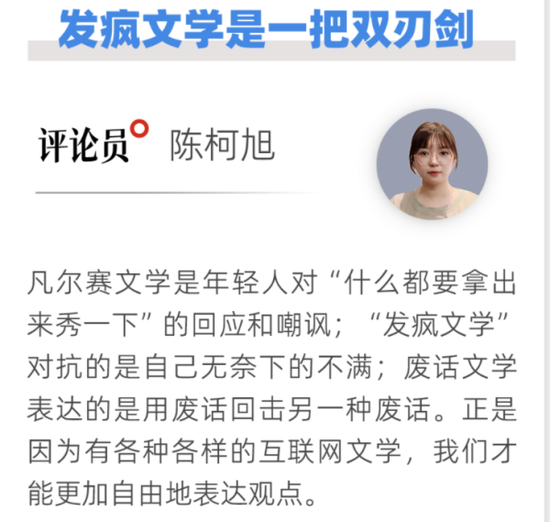 但是,“发疯”过后,“发疯文学”的出圈也引发了不少青年的反思,有网友表示:“网络生态与每个人都是息息相关的,平台也有内容管理的责任。网上冲浪需谨慎,这种情绪宣泄式的语言终究偏娱乐性,也可能会污染我们的语言环境。”