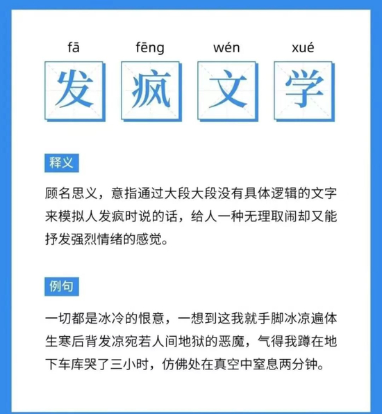 “发疯文学”,指的是一种极度夸张、无序、情绪饱满的文字句式。据悉,“发疯文学”的起源是有人在豆瓣小组发了一段以“我不发疯我说什么”起头的文字,之后逐渐发展成“发疯文学”。