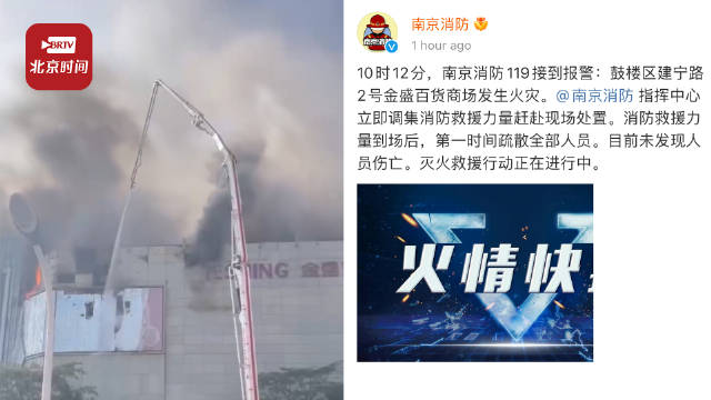南京鼓楼区建宁路2号金盛百货商场发生火灾 灭火救援行动正在进行中