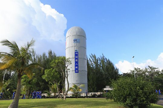 14时37分,发射任务01指挥员廖国瑞的口令响彻发射场区。远远望去,超大整流罩上印制的五星红旗图案和“中国载人航天”6个蓝色大字格外醒目。探索浩瀚宇宙、发展航天事业、建设航天强国的宏伟画卷在人们面前徐徐展开。