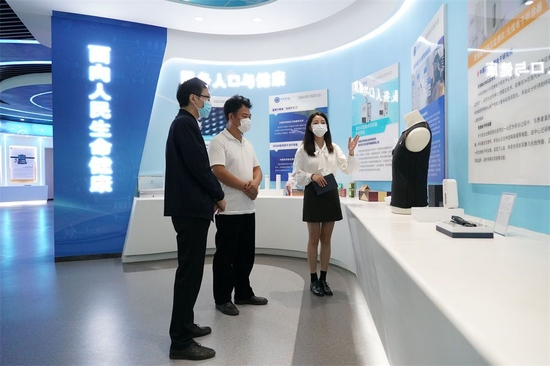 在中科智汇工场,工作人员(右一)在中国科学院科技成果厅向参观者介绍展品( 9月22日摄)。新华社记者 任超 摄